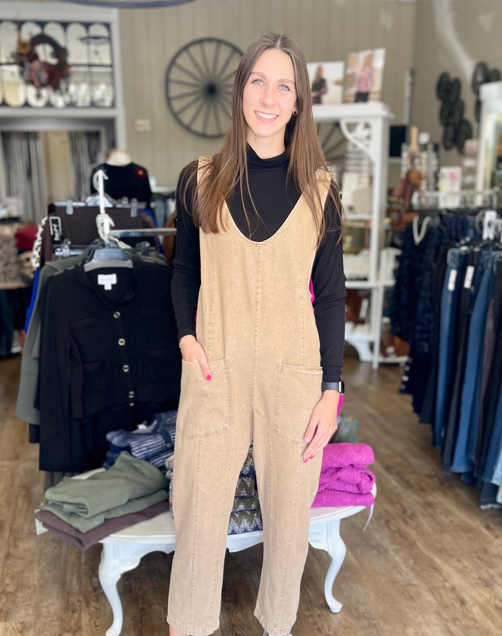 Deep v-neck, front pockets , adjustable straps, ankle length
