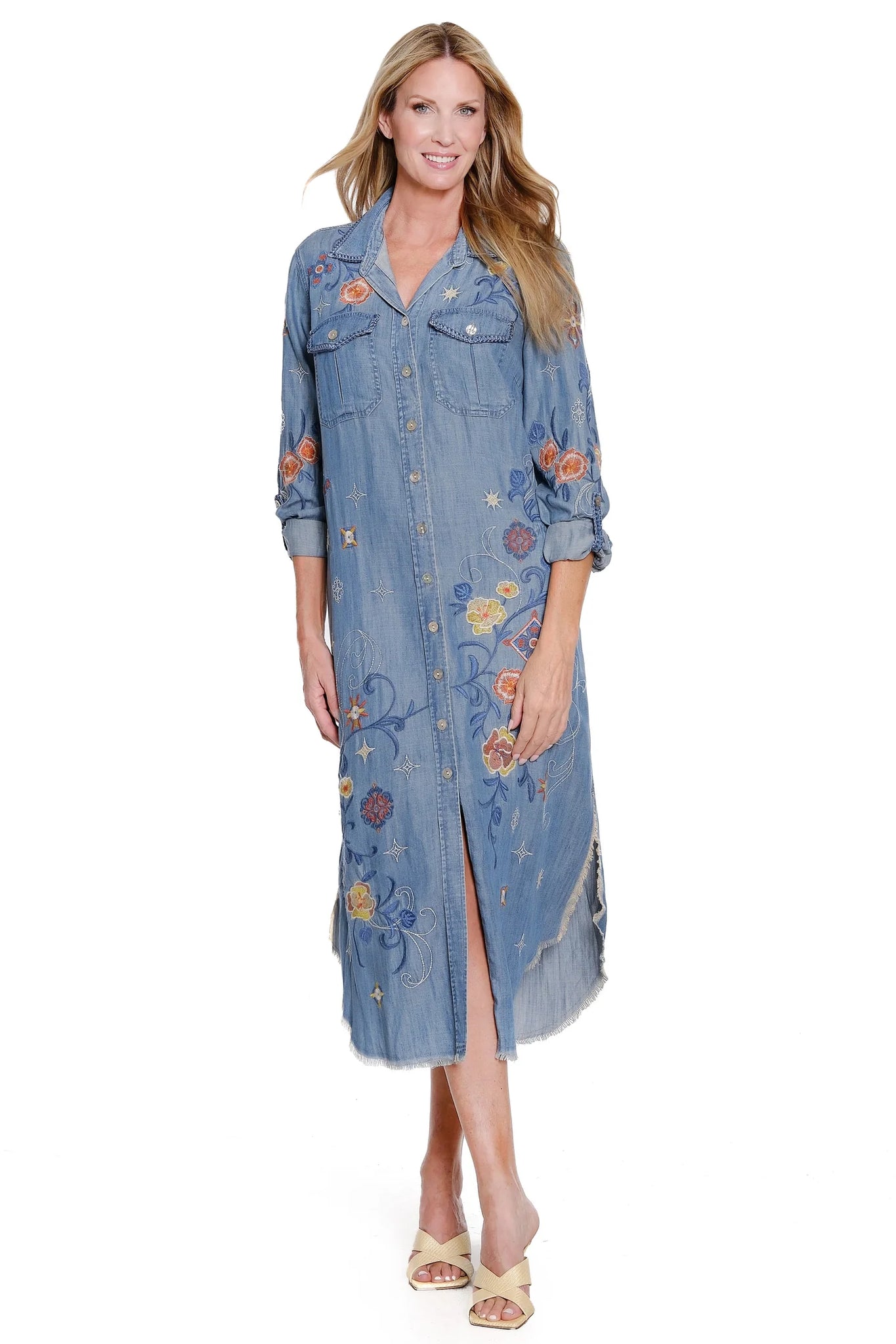 Soft and breathable button front dress with delicate embroidery, tab sleeves and pockets.
